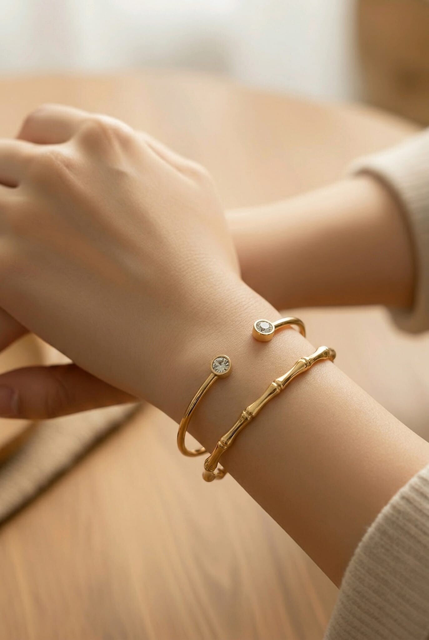 Pulsera dorada de diseño abierto con dos piedras brillantes. Elegante, minimalista y perfecta para cualquier ocasión.