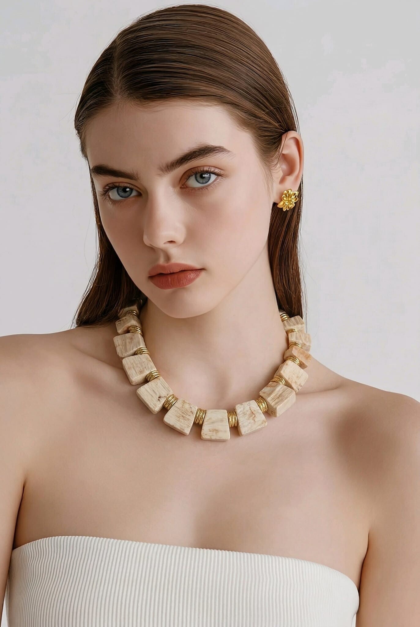 Collar de diseño natural con piezas en tono marfil y detalles dorados. Elegante e ideal para aportar un toque sofisticado y cálido a cualquier look.