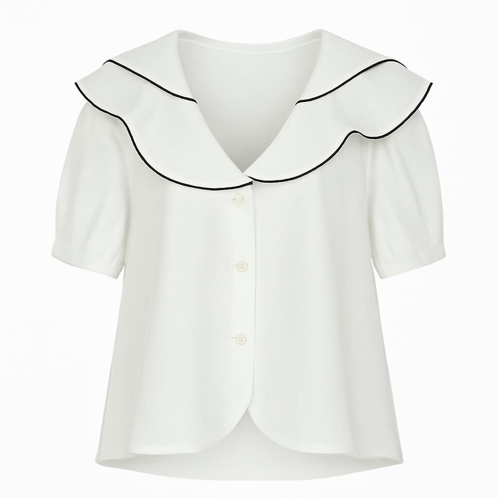 Blusa con cuello tipo babero con ribeteado en azul marino. Perfecta con cualquier vaquero o con un look más formal.