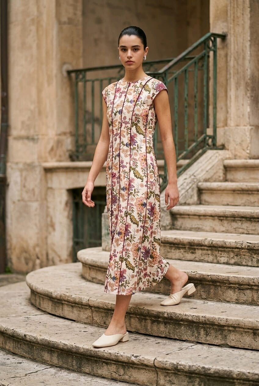 Vestido midi con estampado floral en tonos suaves. Elegante y femenino, ideal para un look atemporal.