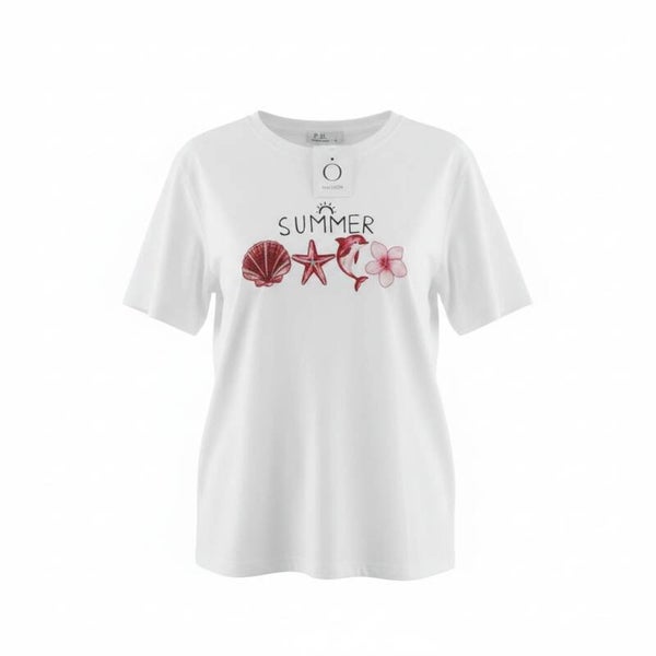 Camiseta blanca algodón corte básico con estampado veraniego de inspiración marina. Fresca y cómoda, perfecta para looks casuales.