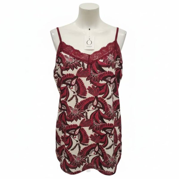 Top lencero con estampados en tonos rojizos y detalle de encaje en escote. Femenino y ligero.