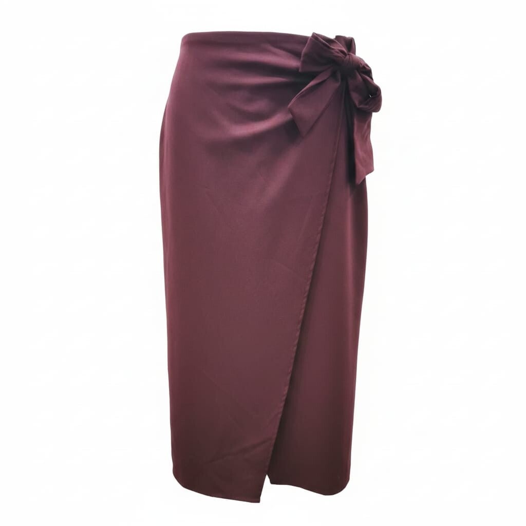 Falda midi en tono burdeos con lazada lateral y diseño cruzado. Elegante y femenina.